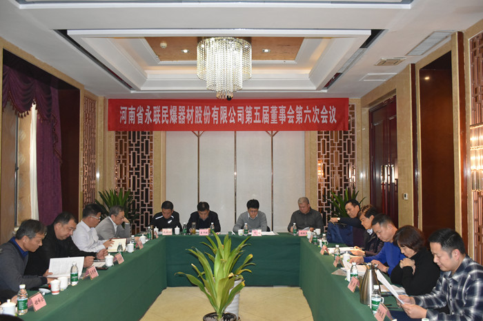 河南省永聯(lián)民爆器材股份有限公司第五屆董事會(huì)第六次會(huì)議于2020年1月9日在鄭州市鄭東新區(qū)福緣國際酒店召開。會(huì)議應(yīng)到董事11人,實(shí)到董事9人;應(yīng)到監(jiān)事5人,實(shí)到監(jiān)事5人,符合《公司法》及公司《章程》的有關(guān)規(guī)定,會(huì)議有效。會(huì)議由董事長劉嵩同志主持,董事會(huì)秘書王虎同志記錄。