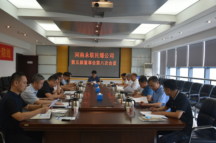 河南省永聯(lián)民爆器材股份有限公司第五屆董事會第八次會議于2020年7月31日在鄭州市惠濟區(qū)開元路79號(7樓會議室)召開。會議應(yīng)到董事11人,實到董事10人(1人請假并委托投票),應(yīng)到監(jiān)事5人,實到監(jiān)事4人,符合《公司法》及公司《章程》的有關(guān)規(guī)定,會議有效。會議由董事長劉嵩同志主持,董事會秘書王虎同志記錄。