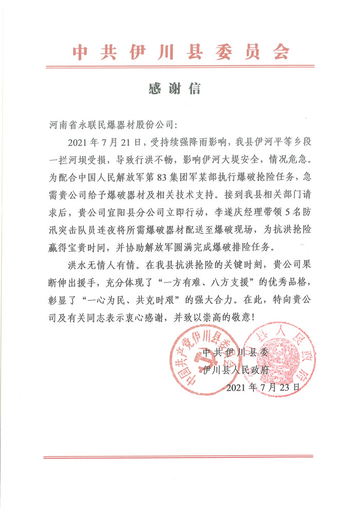 7月19-22日,河南省多地持續(xù)遭遇極端強(qiáng)降雨天氣,造成重大人員傷亡和財(cái)產(chǎn)損失。20日,洛陽市伊川縣境內(nèi)伊何灘攔水壩出現(xiàn)約20米決口,河堤受損嚴(yán)重,攔水壩隨時(shí)可能垮塌。危難當(dāng)頭,宜陽縣分公司臨危受命,不畏艱險(xiǎn)、迎難而上,圓滿完成了爆破搶險(xiǎn)任務(wù)。7月23日,公司收到了中共伊川縣委、伊川縣人民政府發(fā)來的一封感謝信,高度贊揚(yáng)宜陽縣分公司對伊川縣伊河平等鄉(xiāng)段一攔河壩爆破搶險(xiǎn)任務(wù)所做出的貢獻(xiàn),感謝宜陽縣分公司在危難關(guān)頭無私無畏,全力以赴協(xié)助第83集團(tuán)軍某部完成爆破排險(xiǎn),確保人民群眾的生命財(cái)產(chǎn)安全。