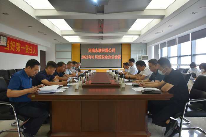 2022年8月26日,河南省永聯(lián)民爆器材股份有限公司召開(kāi)了8月份安全辦公會(huì)議,公司領(lǐng)導(dǎo)班子、安委會(huì)成員、安委會(huì)辦公室成員以及淇縣、光山縣、焦作市、安陽(yáng)市、內(nèi)鄉(xiāng)縣、郟縣等6家分公司負(fù)責(zé)人參加了會(huì)議。會(huì)議由公司副總經(jīng)理靳義國(guó)主持,公司董事長(zhǎng)、總經(jīng)理劉嵩參加會(huì)議并講話(huà)。